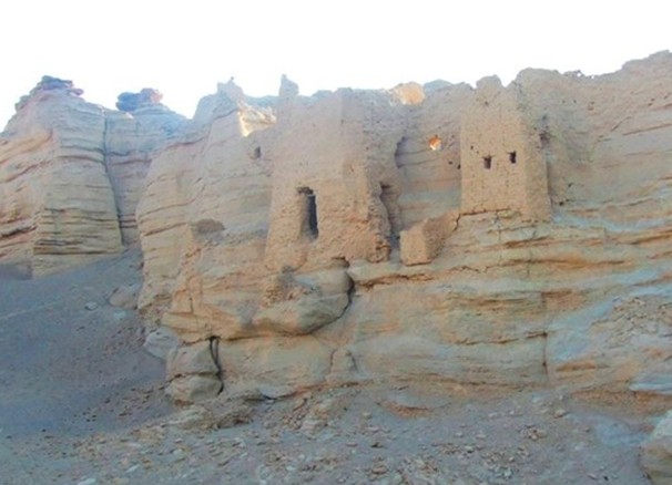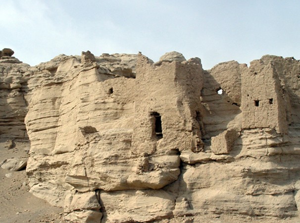 艾斯克霞爾古城堡 位于新疆哈密地區五堡西南23公里的東魔鬼城中,地理坐標東經92"35' 12”,北緯42‘44’19”,海拔350米,艾斯克霞爾系維語“破舊的古城”之意。艾斯克霞爾古城堡處在一片雅丹地貌的陡壁土巖丘中,背依雅丹而建,遠處望去,城堡和雅丹相融一體無法區分。城堡坐南朝北,為上下二層土坯建筑、殘高6~8米,建在離地面5米多的雅丹 山丘的中上部。