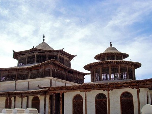 哈密回王陵由墓群和艾提尕爾清真寺(兩部分)組成。墓群原有土木結構的大小拱拜六座,埋藏著歷代回王及其王妃,現剩兩座,最大的拱拜(墓葬)為七世回王伯錫爾、回王福晉以及八世回王莫合買特及其王妃、王族等40余人的墓。該拱拜高17.8米,下部呈長方形,東西長20米,南北寬15米。上為穹隆頂,墓門兩側塔柱中空,有臺階盤旋而上,可至墓頂。拱拜南側,有木質亭式拱拜2座。東部一座為九世回王沙木胡索特拱拜;西部一座為臺吉拱拜。九世回王拱拜底部正方形,邊長各15.5米,內部以土坯壘砌伊斯蘭式的穹隆頂墓室,外部于垣墻內及四周用亭柱支撐漢族亭樓木結構的八角攢尖頂,建筑將墓室罩在其中,飛檐起脊,雕梁畫棟。這兩座木質拱拜,版權所有山東聊城聊之旅國際旅行社有限公司,轉載必究!在建筑形式上,以伊斯蘭式的穹隆為基礎,同時吸收了內地八角攢尖頂及蒙古式盔頂的木質結構建筑形式,將多種風格融為一體,在新疆的伊斯蘭陵墓建筑,極具特色,是中原文化、蒙古文化和伊斯蘭文化相融合的產物。