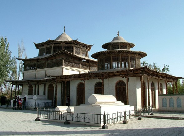 西邊的艾提尕爾清真寺,修建于一世回王額貝都拉時期,經四世回王玉素甫及六世回王額爾德錫爾的擴建,清真寺東西長60米,南北寬38米,占地2280平方米。土木結構的一層伊斯蘭式建筑,內部有108根紅木柱支撐,東西排列。寺頂彩繪花草圖案,并開有天窗。寺內墻壁粉白,上書古蘭經文,周圍再飾花草。每年肉孜節和古爾邦節,城鄉穆斯林群眾都來此禮拜,寺內外可容納5000~6000人以上,其規模之大,居東疆之首。回王陵院內莊重肅穆,古樹參天(桑、榆、楊、柳),占地20畝,屬新疆重點文物保護單位,每年接待近萬人參觀。