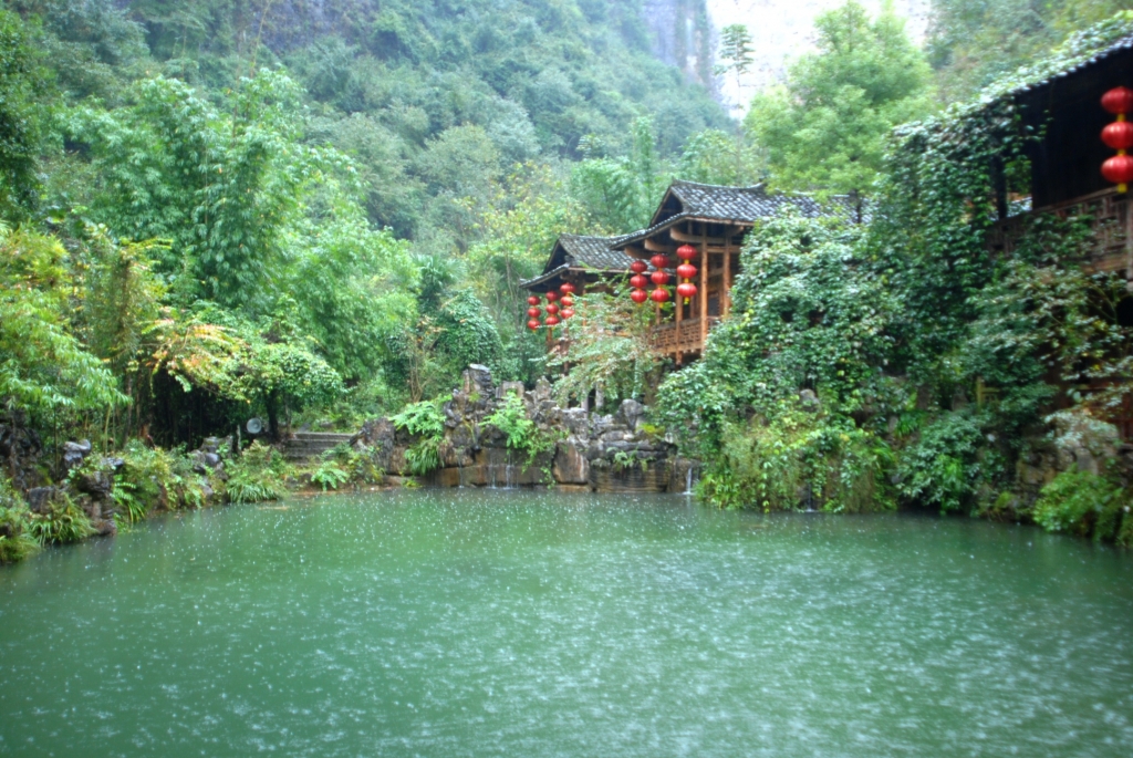 桃花源景區入口處是一片茂盛蔥郁的桃樹林,一條清凈小溪潺潺流過,若是待到陽春四月,便正應了詩中那句"忽逢桃花林,桃花源夾,岸數百步,中無雜樹,芳草鮮美,落英繽紛",行人慢慢走入洞穴,靜聽巖壁滴水落珠之聲,忽覺一股脫俗之意,再前行便是豁然開朗的田園景色:"土地平曠,屋舍儼然,有良田美池桑竹之屬。"在一瞬間,便恍若隔世,返璞歸真。
