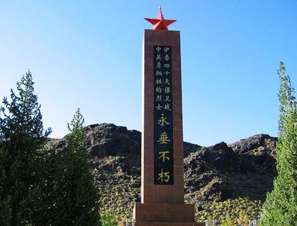 烈士陵園是伊吾人民為了緬懷在伊吾四十天保衛戰中壯烈犧牲的革命烈士而建的。1950年春,在伊吾曾經發生了震驚全國、震破敵膽的伊吾四十天保衛戰。奉毛主席向新疆進軍、屯墾戍邊的命令,我解放軍一營二連全體官兵在全國戰斗英雄胡青山副營長的率領下先后進駐伊吾。1950年的伊吾偽縣長艾拜都拉與匪首烏斯曼、堯樂搏斯相勾結,企圖以伊吾為據點發起大規模的武裝叛亂。解放軍進駐伊吾后,兵分三路,一路由全國勞動模范趙富貴連長帶領進駐淖毛湖,一路進駐下馬崖,還有一路由胡青山副營長駐扎在縣城。解放軍進駐伊吾后叛匪加快了叛亂活動,他們秘密切斷了電話線、破壞了交通、裹脅走了縣城的所有居民,我解放軍一營二連就是在這種內無群眾支持、外無援軍的情況下,監守山城四十個日日夜夜,終于堅持到大部隊援軍的到來,取得了伊吾四十天保衛戰的全面勝利。彭德懷總司令發來慰問電嘉獎二連,并且被解放軍西北軍區第一野戰軍授予“鋼鐵英雄連”的光榮稱號。