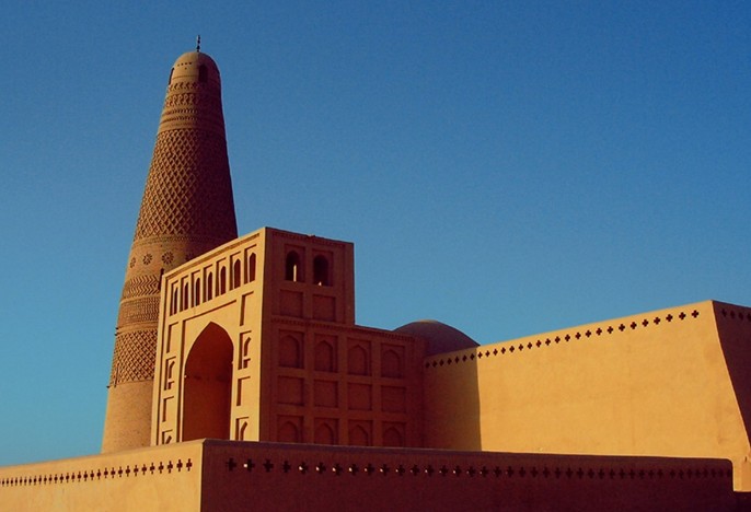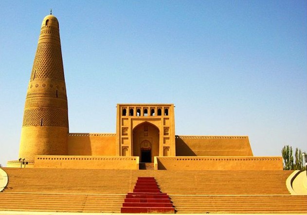 額敏塔,全稱為額敏和卓報恩塔,又稱蘇公塔,當地維吾爾群眾稱之為吐魯番塔,高高矗立于吐魯番市區東南2公里處,是新疆現存最大的古塔,也是我國百座名塔中唯一一座伊斯蘭風格的古塔,1985年列為國家重點文物保護單位。額敏塔坐落在新疆吐魯番市葡萄鄉木納爾村南面的一處開闊臺地上,西距吐魯番2公里,東面與安樂古城相鄰。
