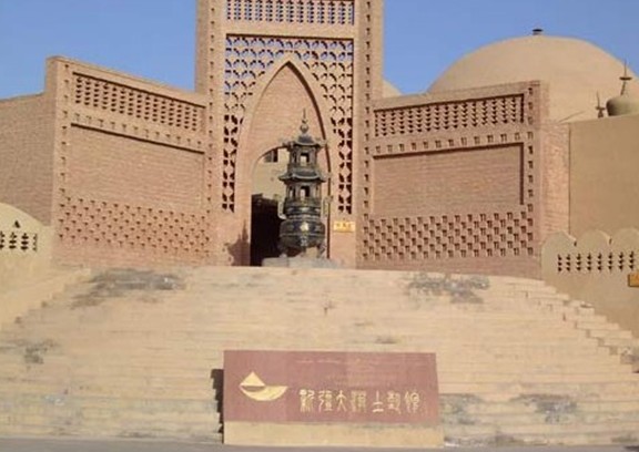 煙云燎繞的火焰山下,郁郁蔥蔥的木頭溝畔,一座規模宏大的人文 景觀,以其獨特的藝術風格,屹立在312國道西側,它就是1991年5月對 外開放接待游人的新疆大漠土藝館, 地理坐標89°32′7″E,42°56′ 8″N,海拔140米,由312國道的勝金口往北拐上前往柏孜克里克干佛洞的旅游專線公 路四公里處,便可看到大型停車場后的高坡上矗立著一座高大的民族風格建筑群,正中是十四米高的磚砌圖案大門.