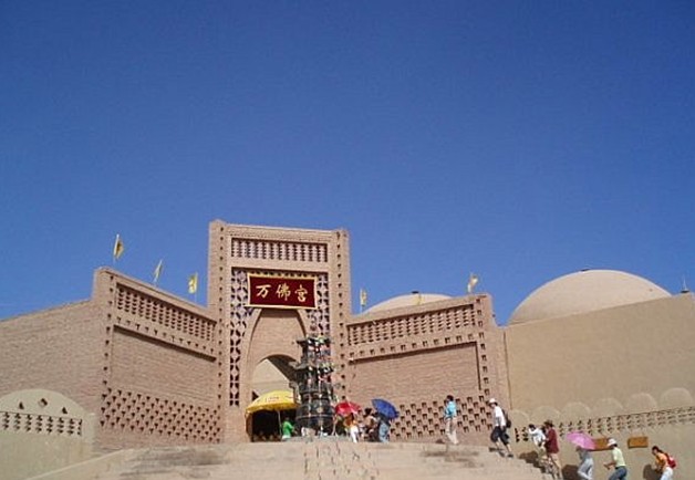 煙云燎繞的火焰山下,郁郁蔥蔥的木頭溝畔,一座規模宏大的人文 景觀,以其獨特的藝術風格,屹立在312國道西側,它就是1991年5月對 外開放接待游人的新疆大漠土藝館, 地理坐標89°32′7″E,42°56′ 8″N,海拔140米,由312國道的勝金口往北拐上前往柏孜克里克干佛洞的旅游專線公 路四公里處,便可看到大型停車場后的高坡上矗立著一座高大的民族風格建筑群,正中是十四米高的磚砌圖案大門,一看便知是吸收維吾爾建 筑風格和吐魯番葡萄晾房而設計的,這就是新疆大漠土藝館。進得大門便是幾座大小不一、錯落有致、下方上圓的穹窿頂建筑,一股西域所特有的神秘氣息撲面而來,誘人遐想。穿過前院,迎面是三座互相連通的穹頂,穹頂四周布滿小塔,酷似金剛寶座塔廟,這就是恢宏巨制萬佛宮,是大漠土藝館的主體工程。這個大型宮堡由三個直徑十米、高十二米的穹窿頂建筑組成,是迄今新疆境內最大的古代佛教藝術殿堂。
