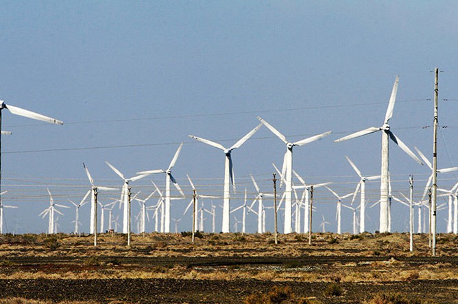 在烏魯木齊去吐魯番的途中,沿路南行,在通往絲路重鎮(zhèn)達(dá)坂城的道路兩旁,上百臺風(fēng)力發(fā)電機(jī)擎天而立、迎風(fēng)飛旋,與藍(lán)天、白云相襯,在博格達(dá)峰清奇峻秀的背景下,在廣袤的曠野之上,形成了一個蔚為壯觀的風(fēng)車大世界。這里就是目前我國最大的風(fēng)能基地——新疆達(dá)坂城風(fēng)力發(fā)電廠。
