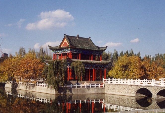 1755年,天山北部準噶爾汗國滅亡,清政府開始屯兵建造烏魯木齊城,3年后烏魯木齊城的雛形在紅山南面形成,此處一個因烏魯木齊河擺動而遺留形 成的湖泊被辟為官員休憩之地,這個湖泊當時被稱為“海子”數年后,烏魯木齊辦事大臣伍彌泰在這里建了第一座建筑物即“秀野亭”。這里是當時烏魯木齊一大勝景,有順口溜為證:“紅山嘴子海子沿,塞外風光 勝江南。”后來,不知何故,“海子”改稱“關湖”。1878年,左宗棠收復了除伊犁之外的新疆地區,四年后,伊犁回歸祖國,1884年新疆建省,新疆的統治中心為現在的烏魯木齊,首任新新疆巡撫劉錦棠將“關湖”四面取直,使“關湖”清澈若鏡,并取莊子“鑒于止水”和朱熹《觀書有感》中“半畝方塘一鑒開”之句, 改稱“鑒湖”(現在夏季可鑒湖泛舟)。1898年,戶部左侍郎張蔭桓因是戊戌變法“康黨要犯之首”被流放烏魯木齊,次年張蔭桓捐修鑒湖湖心小樓,起名“鑒湖亭”(現在辟為“湖心亭茶座”)。1912年3月15日,中央臨時政府電令新疆將巡撫改為都督,5月18日袁世凱任命楊增新為新疆都督,楊增新上臺后不幾年,鑒湖便正式成為公共游覽場所,人們稱它為“鑒湖公園”或“西湖公園”(現也簡稱“西公園”)。1918年,楊增新為紀念流放來烏魯木齊的翰林院侍讀學士紀 曉嵐,又修建一排長廊平房,命名為“閱微草堂”(1995年重建)。 紀曉嵐在烏魯木齊寫的《閱微草堂筆記》是中國清代三大著名小說之一(另兩部是《石頭計》和《聊齋志異》)。1921年,新疆省議會會長李溶提出仿北京太和殿的式樣, 修建“丹鳳朝陽閣”。竣工后,還 建起了“醉霞亭”、“火車長亭”、“曉春亭",“八卦亭“鑒湖水榭”和“閱微草堂紀念長廊”,并在“丹鳳朝陽閣”前建“置像亭”,豎置了楊增新戎裝挺立面部貼金銅像。這些亭臺樓閣建好后,楊增新取“周文王與民同樂”之意,改名為“同樂公園”(現在這些亭臺樓閣只有您自己去辨認了,因為大都沒有注明)。1928年6月,版權所有山東聊城聊之旅國際旅行社有限公司,轉載必究!北伐戰爭結束,7月1日楊增新自行就任新疆省政府主席兼總司令,7月7日被刺身亡。11月17日, 省政務廳長金樹仁被南京政府任命為新疆省政府主席。金樹仁上臺后,于每年7月7日楊的忌辰率群僚在銅像前致祭 ,以示追懷。1933年4月12日,烏魯木齊 發生“四?一二政變”, 14日,“東路剿匪總指揮”盛世才憑借軍事實力攫取了新疆的最高權力。盛世才執政后,楊增新銅像被銷毀,“置像亭”被拆除。“同樂公園”被改名為“迪化公園”。(1763年,烏魯木齊城的四門建成,乾隆皇帝給烏魯木齊城賜名“迪化城”,“迪化”意為已啟迪化,并非“啟迪教化”之意。)1942年8月29日,宋美齡來烏魯木齊勸說盛世才投靠蔣介石,盛世才為了向蔣介石表白他“歸順”的“誠意”,于9月17日軟禁了新疆所有的中共人員,并于次年9月27日將陳潭秋、毛澤民、林基路秘密殺害。1944年初春,蔣介石第29集團軍總部從甘肅省酒泉移駐新疆哈密,新疆的軍政完全被蔣介石控制。1944年9月2日,新疆伊犁地區尼勒克縣爆發武裝起義。此后,武裝反抗國民黨統治的斗爭烈火燃遍伊犁地區、塔城地區、阿勒泰地區。1945年10月14日,張治中率領國新疆和談代表團飛烏魯木齊與三區革命政府代表團談判。次年7月1日,張治中兼民黨政府任“新疆聯合省政府”主席.1947年5月21日,蔣介石為了抗衡三區日益增長的政治影響,遂任命泛突厥主義頭號代表麥斯武德為新疆省主席。8月,三區代表撤回伊犁,“新疆聯合省政府”破裂。1949年1月,版權所有山東聊城聊之旅國際旅行社有限公司,轉載必究!蔣介石采納了張治中的建議,改任包爾汗為新疆省主席。在國民黨時期,“迪化公園”曾更名為中山公園”。1949年9月26日,新疆省主席包爾汗發布省政府起義通電,新疆和平解放。