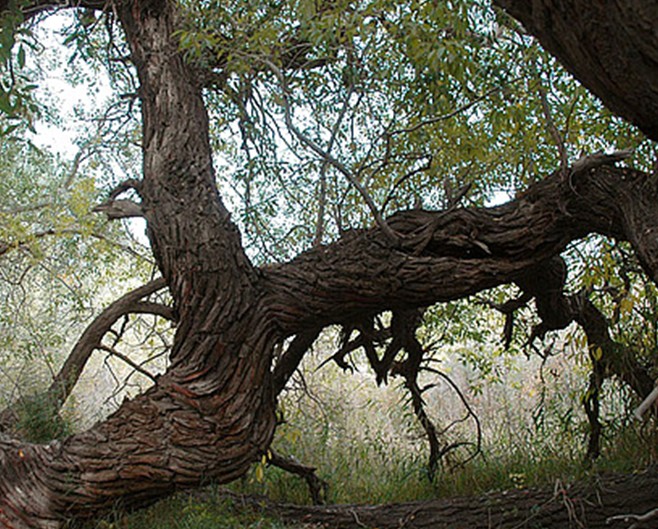 墓地周圍為戈壁荒丘,圓中卻以美麗奇特的大自然風(fēng)光、豐富多彩的植物資源、古樸淳厚的少數(shù)民族文化而享有盛譽(yù)。園中的樹(shù)木種類很多,有楊樹(shù)、榆樹(shù)、柳樹(shù)、白蠟樹(shù)、還有核桃、杏樹(shù)等。那些蒼勁的古樹(shù),有的曲折盤旋,貼地而伸;有的匍匐在地,猶如龍蛇之狀;有的軀干壯碩穩(wěn)固,枝條隨風(fēng)起舞;有的樹(shù)頭與根部相連,分不清哪是根,哪是枝;有的樹(shù)倒地后,又從根部生出新枝,筆直向上,長(zhǎng)成參天大樹(shù)。園中有一棵斜長(zhǎng)的大樹(shù),根部早已腐朽,而樹(shù)冠依然生機(jī)勃勃。園中最高大的一棵楊樹(shù),據(jù)資料介紹高96.23米,直徑6.25米。