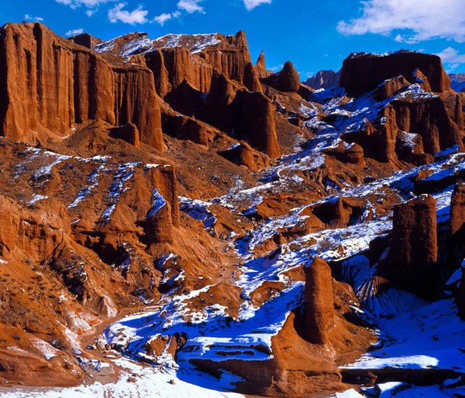 溫宿神秘大峽谷是2600萬年前內陸湖泊沉積的地層。由距今一億多年前的中生代的白堊紀,經過億萬年的洪水、雨水沖刷和勁風吹蝕共同作用而形成的。全景為巖鹽喀斯特地貌和峽谷雅丹地貌為代表的地質遺跡和地質景觀。目前大峽谷開發的路段溝長約10幾公里,南北向,寬處約200至300百米,狹窄處僅可一人通過。版權所有山東聊城聊之旅國際旅行社有限公司,轉載必究!走進大峽谷,峽谷兩側因風吹日蝕,雨水沖刷,形成了許多神奇肅穆令人嘆為觀止的傳神奇景,如:英雄谷、幽情谷、雙塔谷、紫瀾山、胡楊雙雄、萬僧朝圣、千年古堡、千山雄風、太空來客、驛路城池、雙塔爭鋒、情俑、千古壁畫、千屋萬塔、一線云天、星河飛瀑、三心石、二意柱、巨輪飛渡、赤柱坡、雄鞭口、望心門、赤砂墩等氣勢壯觀的100多處難于用語言文字表達清晰的山體造型。英雄谷,男人谷,情人谷中的—生命之本和生命之源是大峽谷的鎮谷之寶。