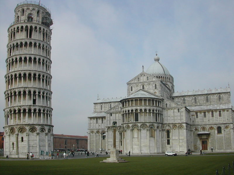 比薩斜塔(意大利語:Torre pendente di Pisa或Torre di Pisa)是意大利比薩城大教堂的獨立式鐘樓,于意大利托斯卡納省比薩城北面的奇跡廣場上。廣場的大片草坪上散布著一組宗教建筑,它們是大教堂(建造于1063年—13世紀)、洗禮堂(建造于1153年—14世紀)、鐘樓(即比薩斜塔)和墓園(建造于1174年),它們的外墻面均為乳白色大理石砌成,各自相對獨立但又形成統一羅馬式建筑風格。比薩斜塔位于比薩大教堂的后面。