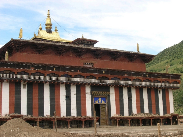 大殿坐西朝東,總建筑面積3334.64平方米。建筑主體呈四方形,邊長(zhǎng)53米,殿內(nèi)柱子林立,共聳立180根柱子,其中64根柱子高約15米。殿堂為三層,高48.15米。下層樓見(jiàn)方長(zhǎng)53米,中層每面長(zhǎng)度為 40.30米,上層每面長(zhǎng)度為12米。這些柱子將殿中的天窗托起,使得原本封閉的大殿,透漏出明亮的光線(xiàn),較好的解決了藏式寺廟建筑中通風(fēng)透氣不暢、光線(xiàn)不足的問(wèn)題。