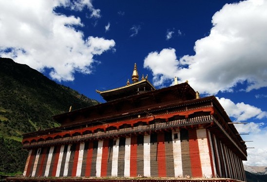 查杰瑪大殿外觀呈正方形狀,長(zhǎng)51米,寬56米。底層繞寺一周設(shè)有無(wú)數(shù)個(gè)轉(zhuǎn)經(jīng)筒,供善男信女們的轉(zhuǎn)經(jīng)朝圣。紅殿和白殿逐漸向里收攏,又飾以飛檐金頂,呈飄逸升騰之勢(shì)。加之整座大殿在顏色運(yùn)用上十分豐富。對(duì)比強(qiáng)烈,上白中紅下花,極富層次和立體感。經(jīng)過(guò)巨大的寺門(mén)進(jìn)入查杰瑪大殿中,抬首隨處可見(jiàn)雕刻精美的菩薩神佛塑像和不計(jì)其數(shù)的唐卡。據(jù)介紹,歷史上類(lèi)烏齊大殿中有大大小小佛像4萬(wàn)余尊,可見(jiàn)其數(shù)量和規(guī)模。