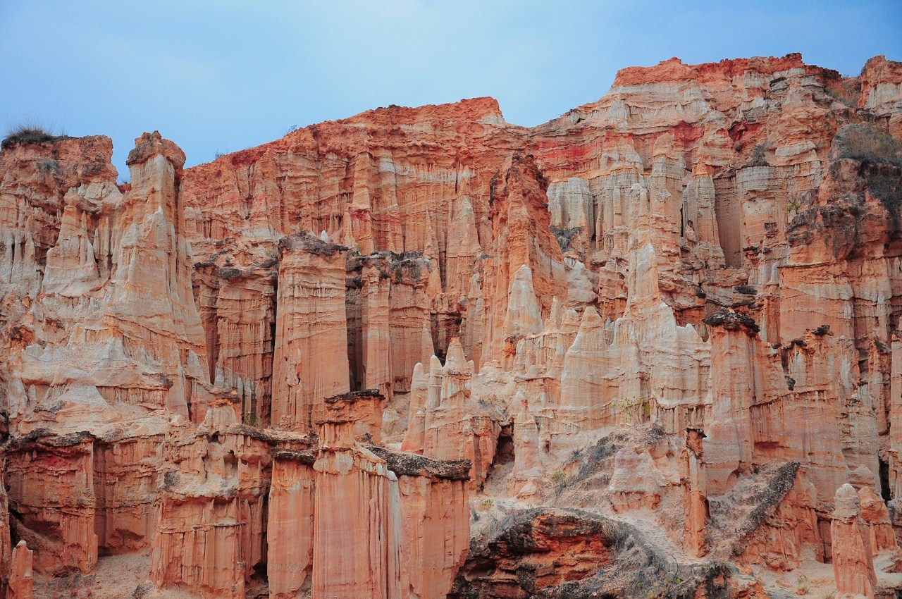 一踏進土林,那千姿百態的造型,就仿佛使人進入另一個新奇的天地。有的土柱如錐似劍,直指藍天;有的像威嚴武士,整裝待發;有的如亭亭少女,凝視遠方;有的土柱頂上雜草叢生,間或長有野花;有的砂石壘壘,裸露身軀……當然,各種形態的土柱是混雜分布的,這就使得土林形成了豐富 多彩,變化層出不窮的姿態,令人嘆為觀止。