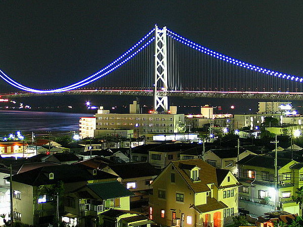 明石海峽大橋:連接本州島和淡路島的明石大橋,于1998年4月開通,全長(zhǎng)3,911米,是世界上最長(zhǎng)的吊橋。夜晚時(shí)候開起燈火,整座大橋猶如珍珠裝飾,故有“珍珠大橋”的美稱。燈光的開放十分講究,平日開四季之顏色的燈,周末與節(jié)日開藍(lán)綠色的燈。舉辦活動(dòng)時(shí),燈光顏色會(huì)不斷變化。報(bào)時(shí)的時(shí)候,整點(diǎn)是彩虹色、半點(diǎn)是寶石色。