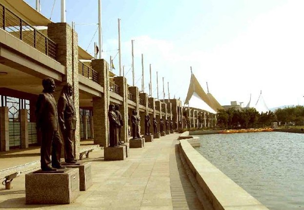 法國建筑家德維爾興致盎然地向筆者談起了規劃藍圖。公園由水陸兩部分組成一個圓形主體,園內道路按地球經緯線和行星軌跡投影設計,寓意人類共同生存的地球。在陸地部分,百名國家元首書寫的和平圣詩與箴言用金箔鑲嵌在石碑上,永久地收藏在展館里;世界五大洲圖形按世界地圖基本形狀分布,平攤展開在整個海灘上,版權所有山東聊城聊之旅國際旅行社有限公司,轉載必究!各大洲圖案中分別建有一個文化廣場,每個廣場依據各洲歷史文化和地域風格精心設計,游歷其間仿佛置身于各大州。在海洋部分,建有一個高118米的海上噴泉,夜間設置在大海中的五面巨大反光鏡,把從山上照射下來的激光折射向廣袤天宇,象征五大洲人民和平生活與日月同輝。公園的山坡上設有一座和平圣火壇,計劃在建成之日,由著名運動員從北京中華世紀壇接力取回圣火。公園總占地面積24萬平方米,版權所有山東聊城聊之旅國際旅行社有限公司,轉載必究!以“世界百名元首和平圣詩碑林”為核心內容,營造出世界人民渴望21世紀和平的強烈氛圍。